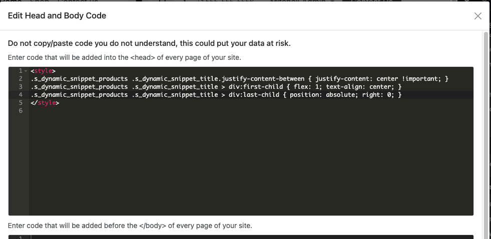 You're building a website on Odoo Website Builder and you've added a Product block, but you can't center the header for it. I was able to get around this by adding custom CSS. Here's what you do: Step 1: On the Website Builder page, click on "Edit," then "Theme." Scroll to the bottom, and you'll see "Code Injection" under "Advanced." Step 2: Click on " and " and add the following to the .s_dynamic_snippet_products .s_dynamic_snippet_title.justify-content-between { justify-content: center !important; }